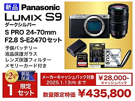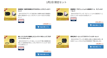 -本日1月2日はレンズ4製品を展開。 -「風景写真撮影おすすめPROレンズ PLフィルターセット」は140,800円。 -「プロフェッショナル高倍率ズーム PLフィルターセット」は211,200円。 -「美しくにじむボケを継承したコンパクト PRO レンズ プロテクトフィルターセット」は83,600円。 -「軽快広角ズームレンズ プロテクトフィルターセット」は66,000円。 -具体的な対象製品は各告知ページ参照。 |