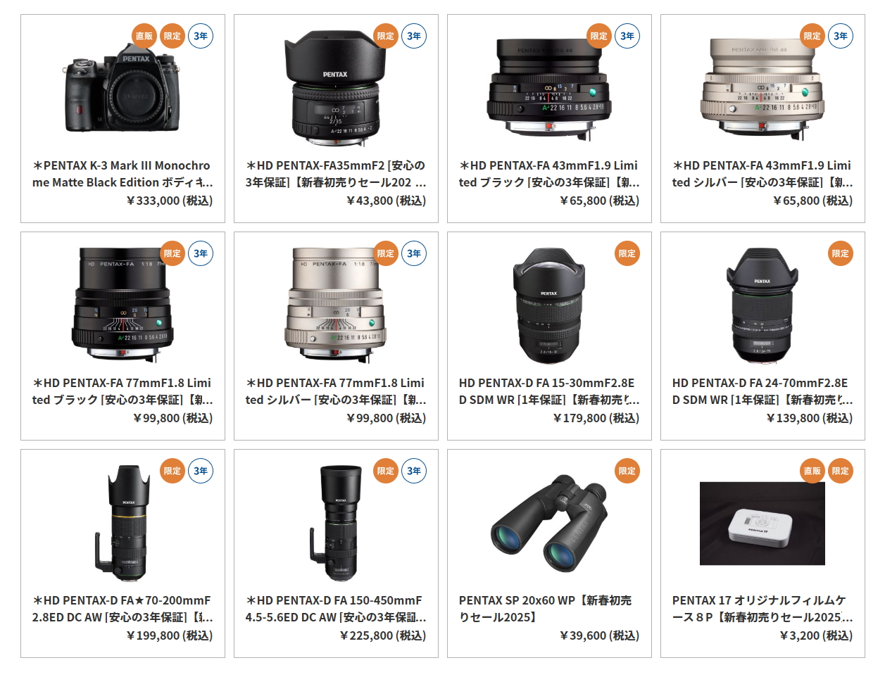 -販売期間は1月6日(月)正午12:00〜1月7日(火)23:59までの約36時間のみ。 -「PENTAX K-3 Mark III Monochrome Matte Black Edition ボディキット(直販限定モデル)」は、333,000円。 -「HD PENTAX-FA35mmF2」は43,800円。 -「HD PENTAX-FA 43mmF1.9 Limited」、65,800円。 -「HD PENTAX-FA 77mmF1.8 Limited」、99,800円。 -「HD PENTAX-D FA 15-30mmF2.8ED SDM WR」、179,800円。 -「HD PENTAX-D FA 24-70mmF2.8ED SDM WR」、139,800円。 -「HD PENTAX-D FA★70-200mmF2.8ED DC AW」、199,800円。 -「HD PENTAX-D FA 150-450mmF4.5-5.6ED DC AW」、225,800円。 -「PENTAX SP 20x60 WP」39,600円。 |