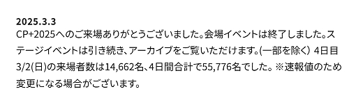 ●CIPA 「CP+2025」の来場者数(速報値)を公開。4日間合計で、55,776名に
